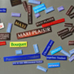 Il y a des bonbons surprises et des réglisses à dérouler pour découvrir une phrase, des mots doux-doux et des maux-petits bobos, des micro mini mots, à saupoudrer sur la table, des bonbons à déballer, des sucres d’orge ou des mots trésor.