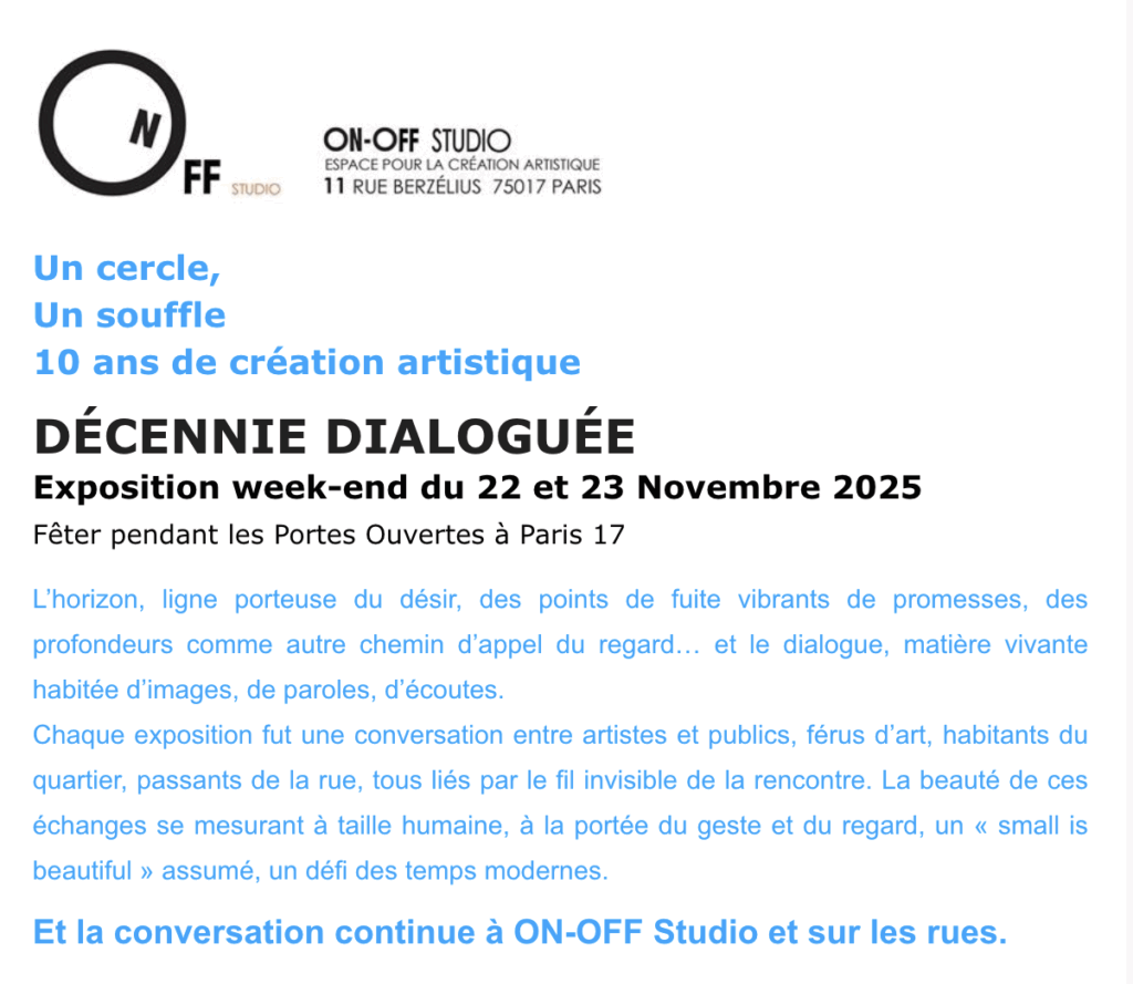 Oh ! C’est un vrai plaisir que de savoir une de mes images intégrée à l’exposition collective du On Off Studio, Paris 17ème, à l’occasion des 10 ans de la galerie.