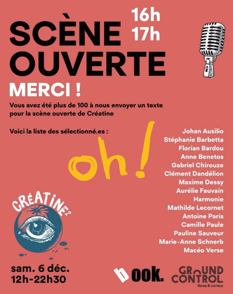 A noter que la scène ouverte sera suivie d’un hommage à Carole Bijou, poétesse et écrivaine, qui a aussi animé la Poésie des bouches sur radio Canut, de 2016 à 2020, que j’avais rencontrée en 2018 à cette occasion.