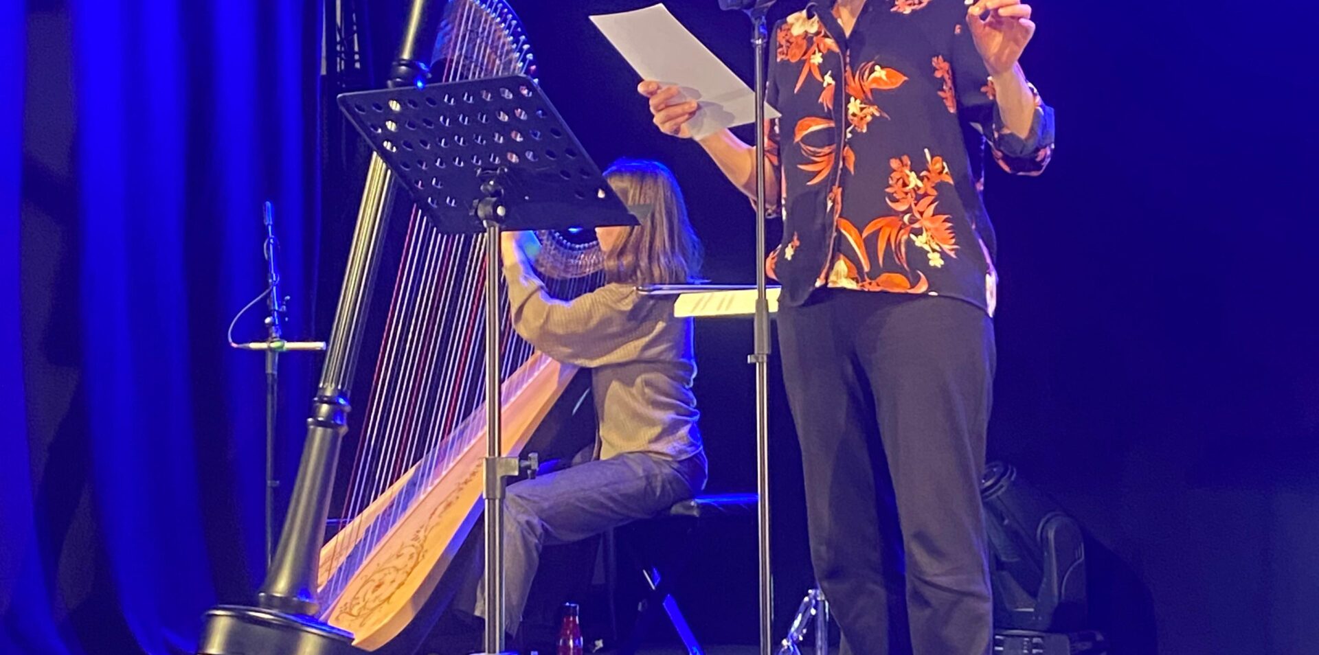 Les préparations pour la scène ouvertes étaient faciles et précises, car Josephine Plagnol, harpiste, qui allait nous accompagner avait déjà réfléchi à chaque lecture, pour pouvoir nous proposer un axe d’imporvisation. C’est elle qui a eu l’idée du chiffon sur les cordes de sa harpe !