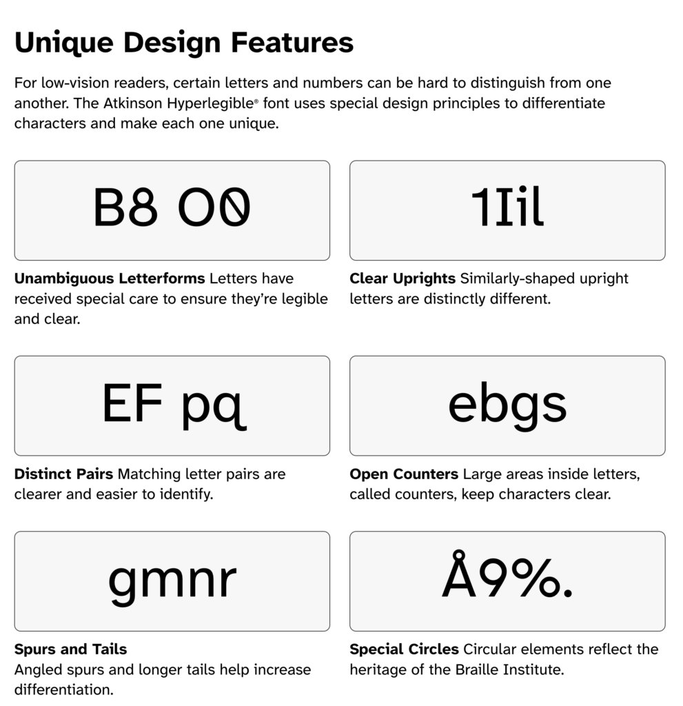 Portant le nom du fondateur de l’Institut Braille, J. Robert Atkinson, elle rend la forme de chaque lettre plus facile à distinguer, et facilite la lecture, même pour les personnes en ayant une vision plus faible.